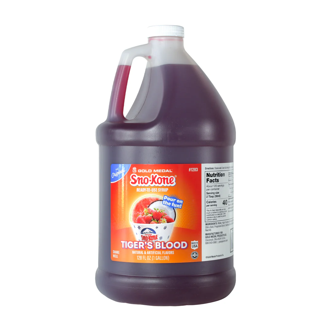 Tiger’s Blood Sno-Kone Syrup delivers a refreshing summer Tiger’s Blood profile in a 1-gallon jug (64-80 servings). Fully compatible with our sno-kone machine rentals in Fort Collins.