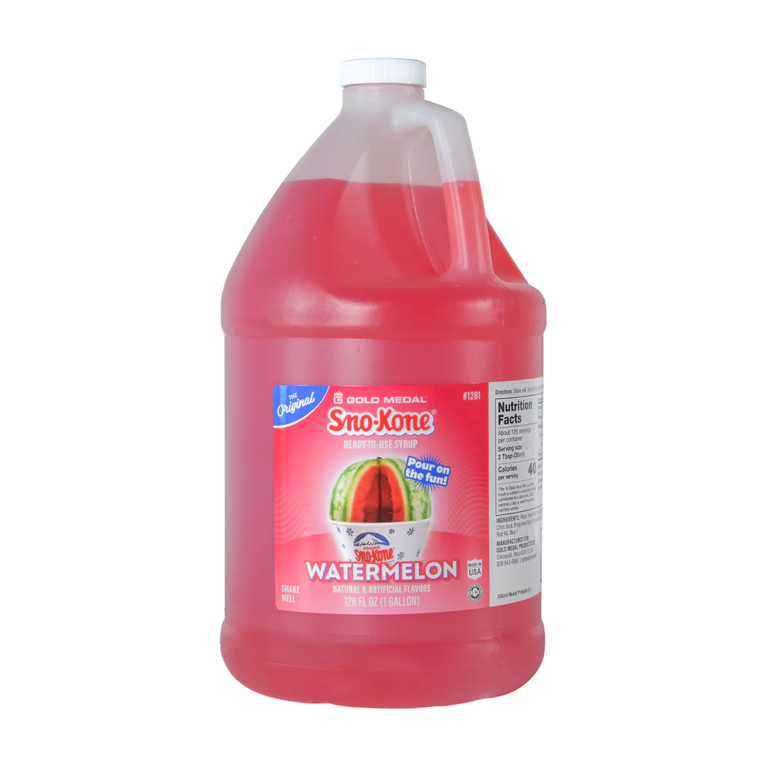 Watermelon Sno-Kone Syrup delivers a refreshing summer watermelon profile in a 1-gallon jug (64-80 servings). Fully compatible with our sno-kone machine rentals in Fort Collins.